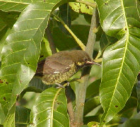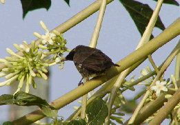 パパイアの花の蜜を吸うくちばしがまだ黄い太陽鳥の幼鳥 Young Sunbird with Yellow Bill on Papaia Flower |